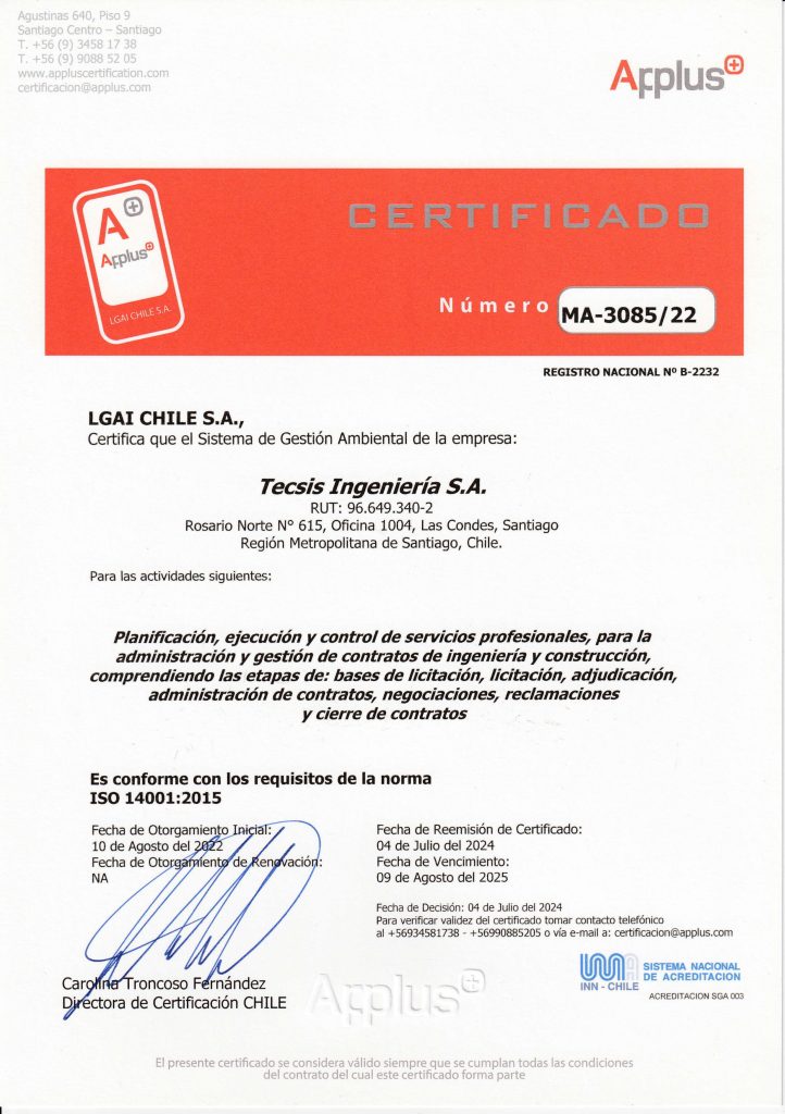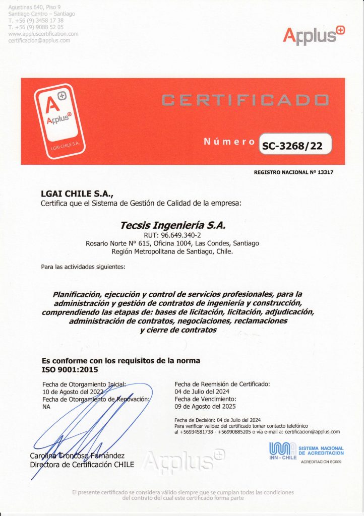 COLABORADORES NOSOTROS Nuestra Empresa Nuestro Compromiso Nuestra Misión Nuestra Visión Nuestros Valores Nuestro Equipo Sistema de Gestión Integrado Alcance de nuestro sistema de gestión integrado Política de nuestro sistema de gestión integrado SERVICIOS Administración de Compras y Contratos Ingeniería Outsourcing Construcción de Obras Civiles Construcción de Redes Construcción de Planta Interna CERTIFICACIONES CLIENTES TRABAJA CON NOSOTROS CONTÁCTANOS NOVEDADES Menu NOSOTROS Nuestra Empresa Nuestro Compromiso Nuestra Misión Nuestra Visión Nuestros Valores Nuestro Equipo Sistema de Gestión Integrado Alcance de nuestro sistema de gestión integrado Política de nuestro sistema de gestión integrado SERVICIOS Administración de Compras y Contratos Ingeniería Outsourcing Construcción de Obras Civiles Construcción de Redes Construcción de Planta Interna CERTIFICACIONES CLIENTES TRABAJA CON NOSOTROS CONTÁCTANOS NOVEDADES Certificaciones Revisa todas las certificaciones con las que estamos respaldados. ISO 9001:2015 ISO 14001:2015 ISO 45001:2018 Copyright © 2024 TECSIS INGENIERÍA S.A.All rights reserved. Servicios Administración de Compras y Contratos Ingeniería Construcción de Obras Civiles Construcción de Redes Construcción de Planta Interna Outsourcing Sistema Gestión Integrado Alcance de nuestro Sistema de Gestión Integrado Política de nuestro Sistema de Gestión Integrado Certificaciones ISO Contáctanos contacto@tecsisingenieria.cl